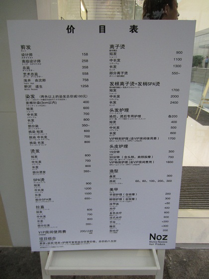 ドアボーイまでいるヘアサロンは日本でもなかなかないが、料金表を見てもいかにハイグレードな店かが一目でわかります。まさにアジアのVSを目指すにふさわしいブランドイメージ全開だ。![]()