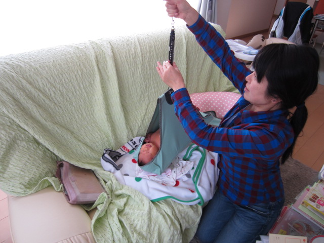 最後に、体重を測りましょう!と言っておもむろにばね秤を取り出し、赤ちゃんを裸にして吊るし始めた時にはさすがにびっくりしたけど・・・絵があまりにも面白くて思わず衝撃の瞬間を激写!