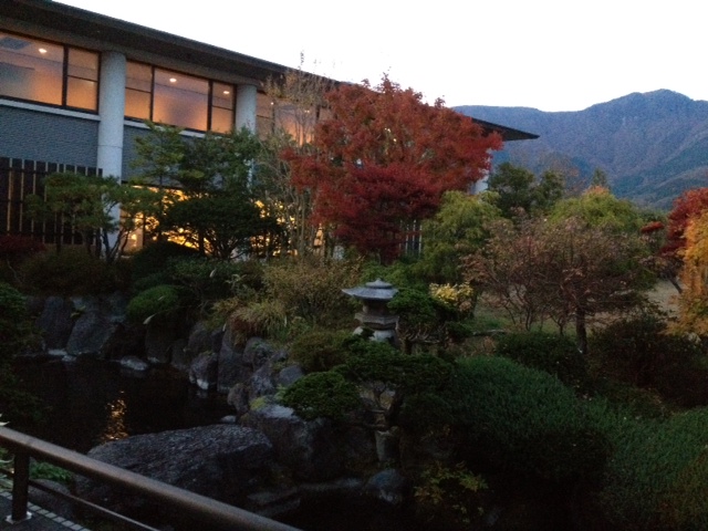 窓の外には、夕暮れに染まる美しい庭園。ニッポンの秋だ~