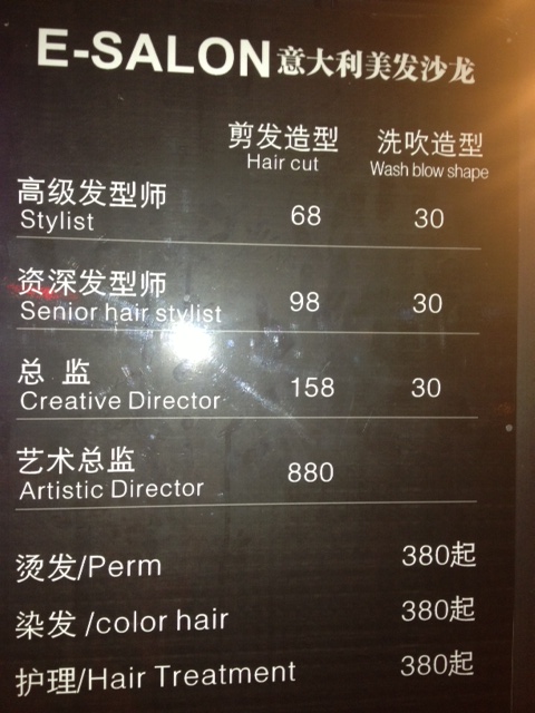 880元といえば、以前Nozの中国一号店の開店レポートでも紹介したように(→http://www.chemin-libre.com/blog/2011/06/noz.html)、上海では珍しくない料金設定だが、こんなところでそれだけ出してカットをしてもらう人がいるんだ、と改めて温州人の経済力とおしゃれ心(?)に感服(笑)。