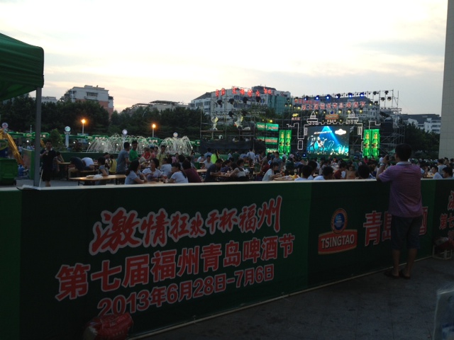 調査会場から一瞬抜けて、夕暮れ時の繁華街を歩いてみると、広場のイベントスペースが青島碑酒のビール祭りでにぎわっていた。