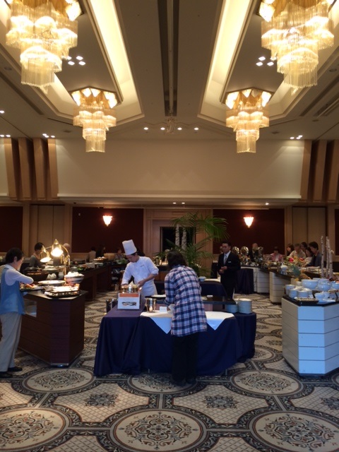 まずは景色のいい席をおさえてぇ、とのんびり構えていたら、数百人は入るというボールルームに入っていちいち取りに行くのが、遠いこと遠いこと。
